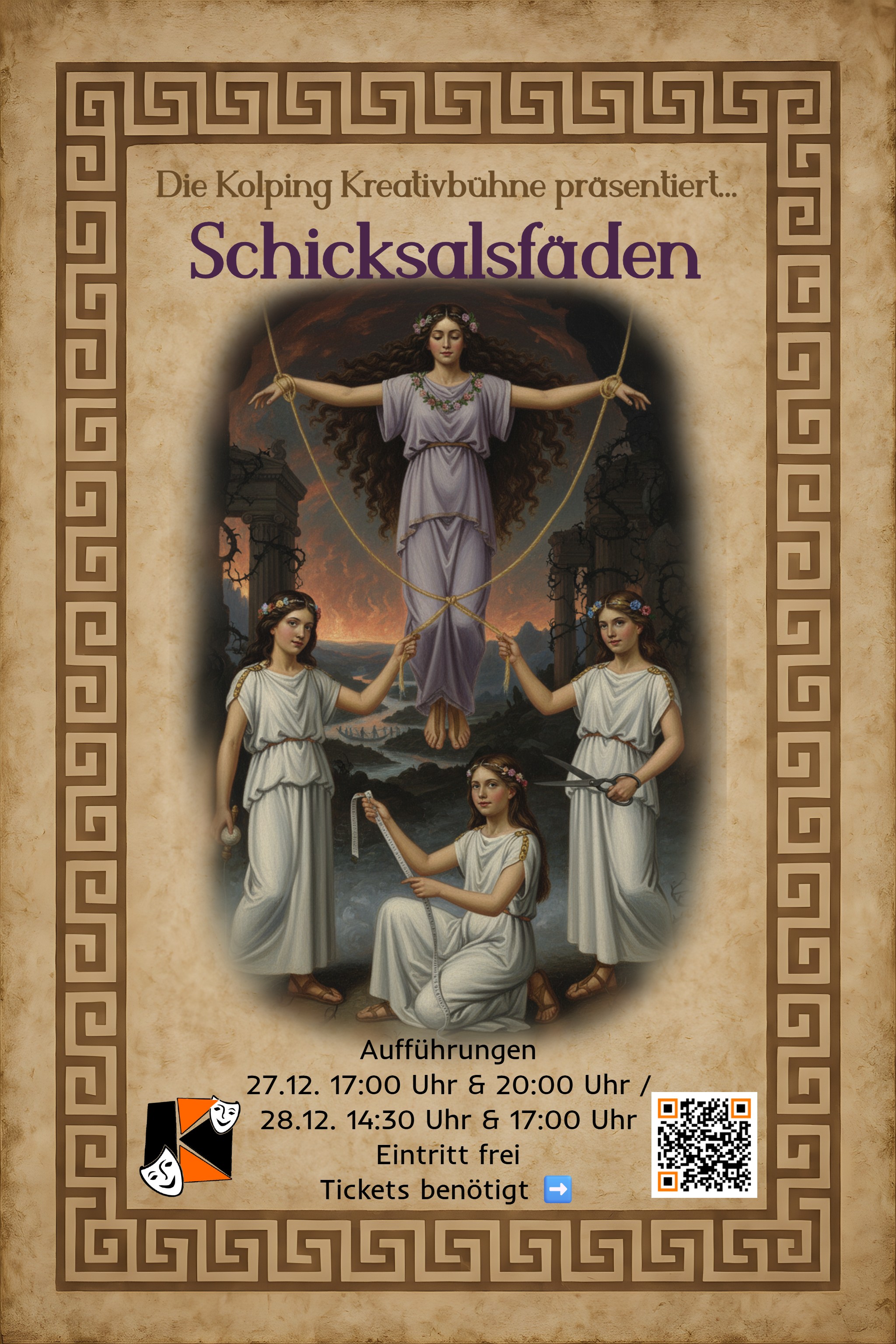 Eine Tragödie, inspiriert von den griechischen Schicksalsgöttinnen, den Moiren. Erlebe die faszinierende Welt der antiken Mythologie auf der Kreativbühne des Kolpingtheaters Ramsen.